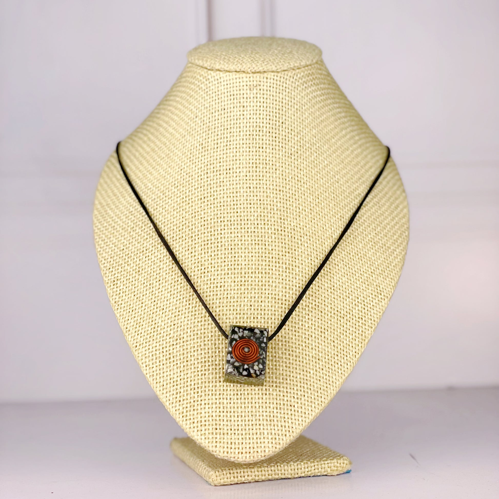 Collar con péndulo o forma geométrica elaborado en orgonita, una poderosa mezcla de resina, metales y cuarzos diseñada para armonizar la energía, transmutar lo negativo en positivo y protegerte de las radiaciones electromagnéticas. Ideal para quienes buscan equilibrio espiritual y bienestar energético en su día a día.